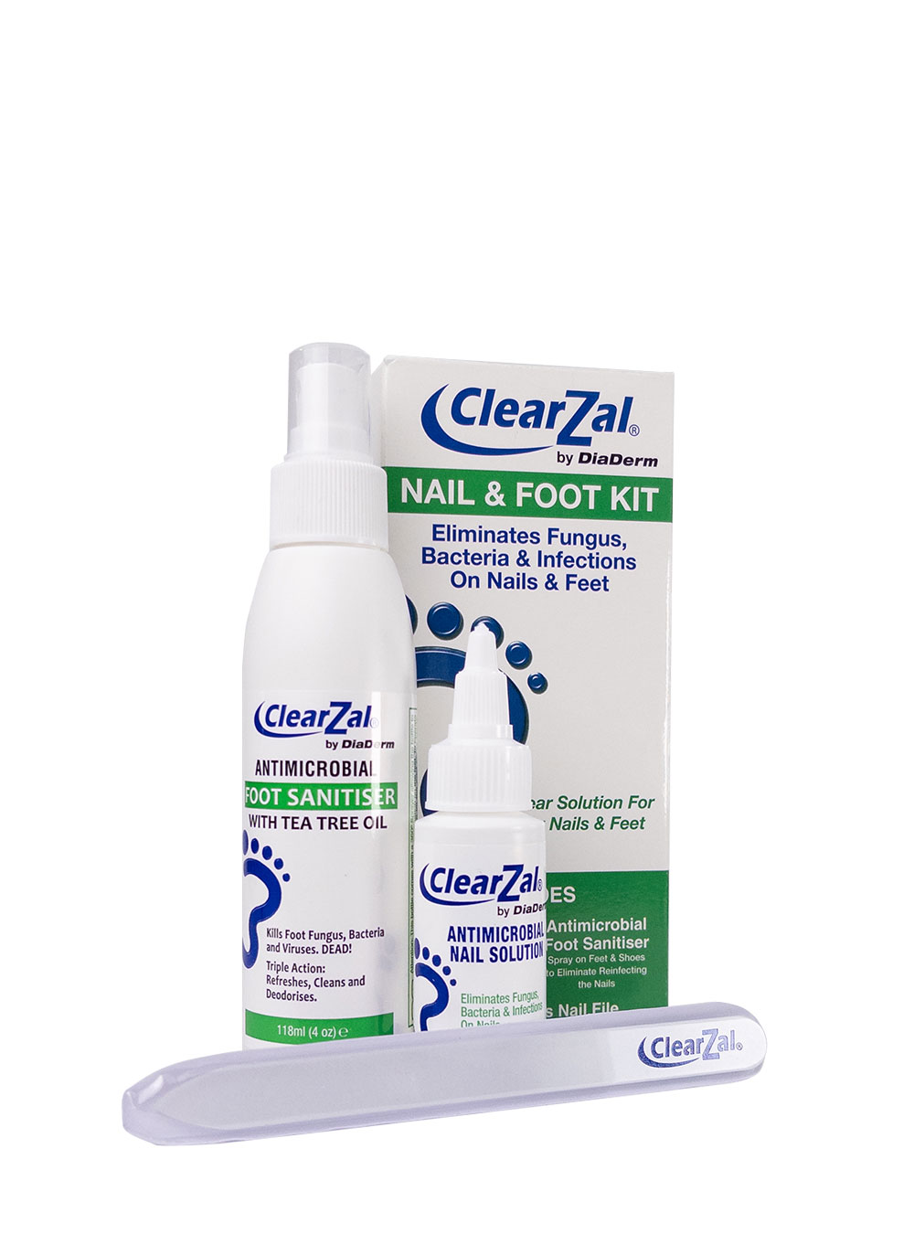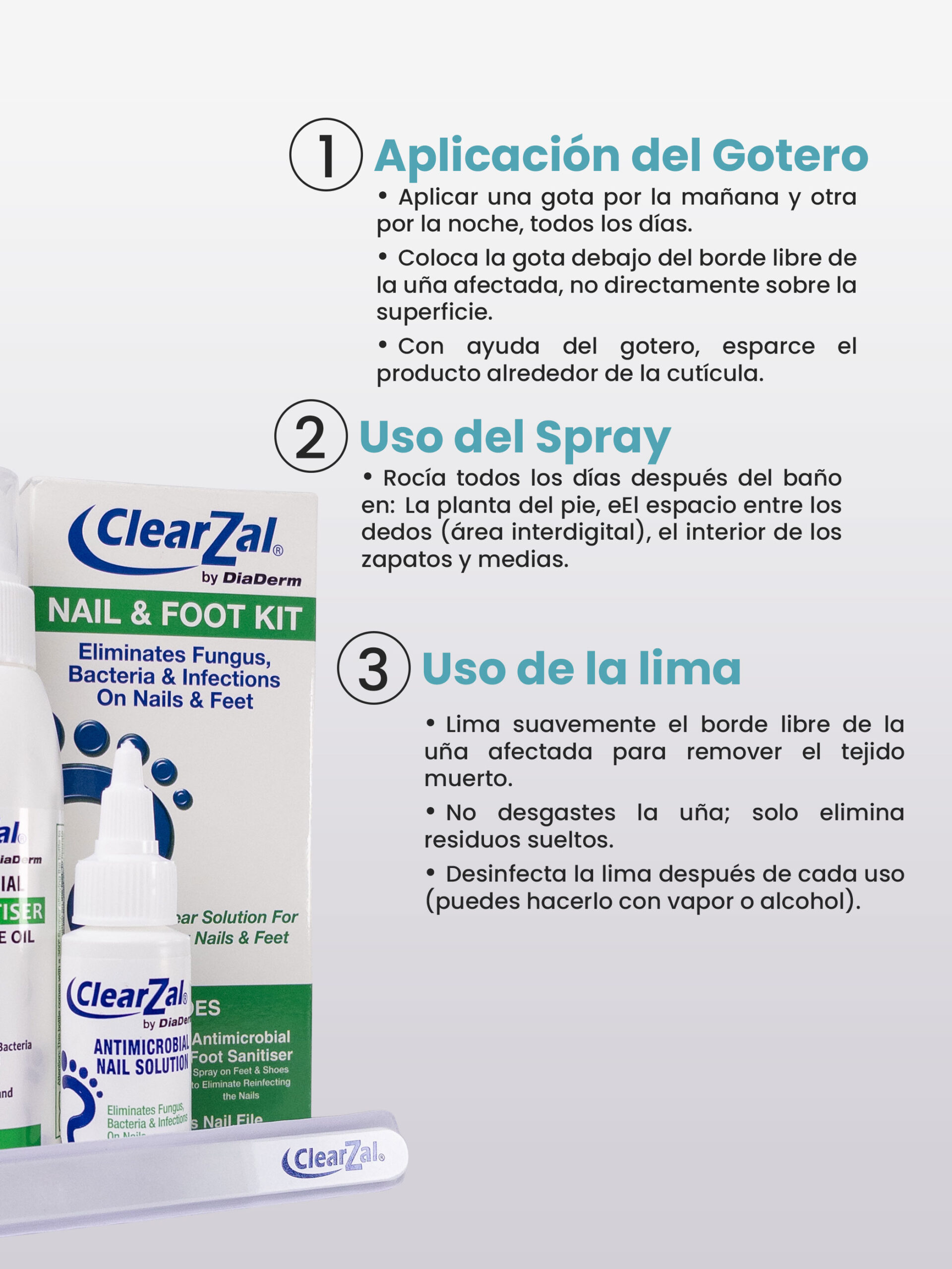 Este sistema combina tres productos diseñados para eliminar infecciones fúngicas y bacterianas desde la raíz: el gotero BAC para uñas, el spray antimicrobiano para pies y zapatos, y la lima premium de vidrio ClearZal. Un tratamiento completo, práctico y fácil de seguir desde casa.