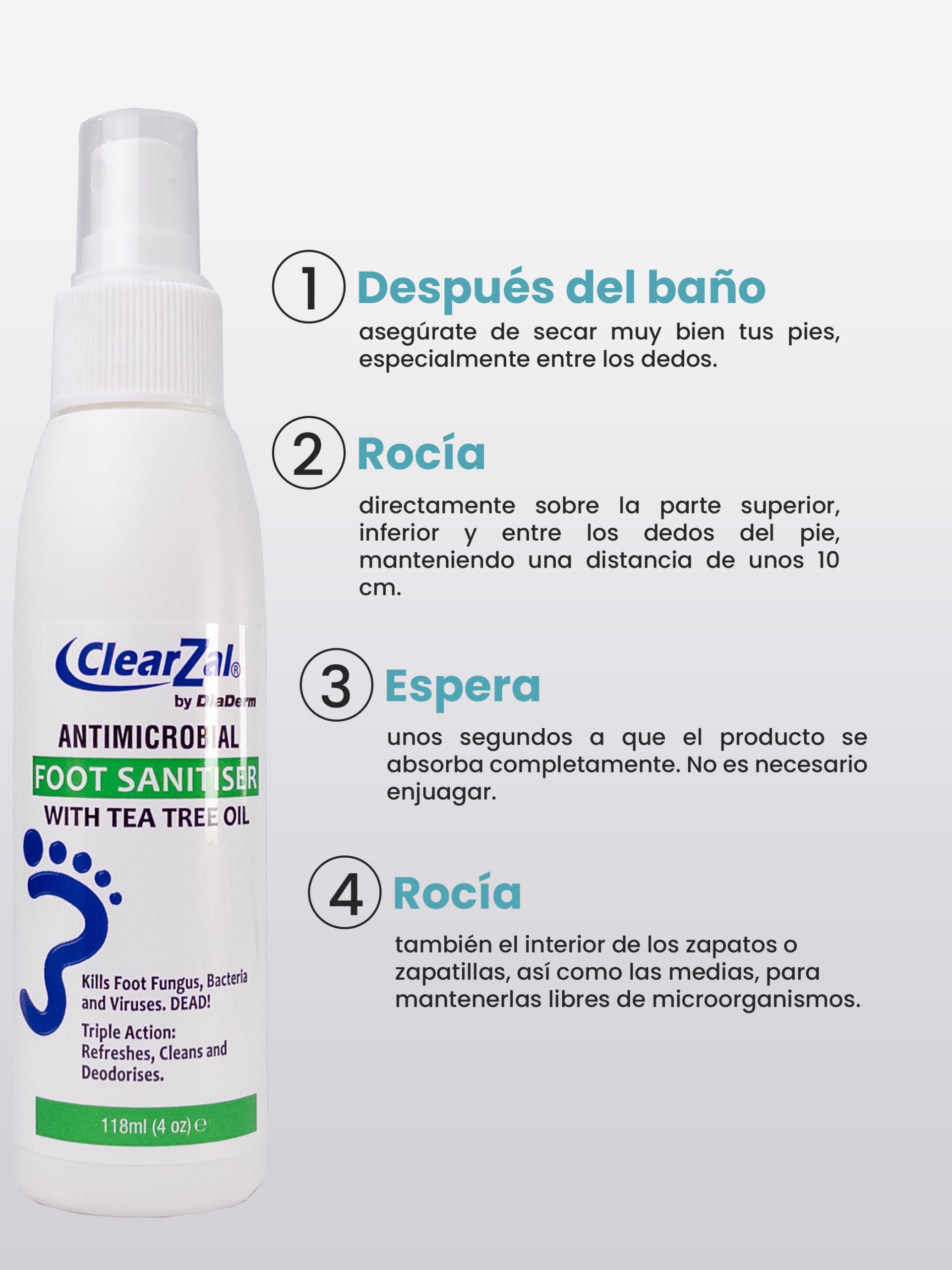 Rocíe cada pie en la parte superior, inferior y entre los dedos una vez al día después del baño, seque bien los pies y rocíe dentro de los zapatos antes de ponérselos y después de quitarlos.